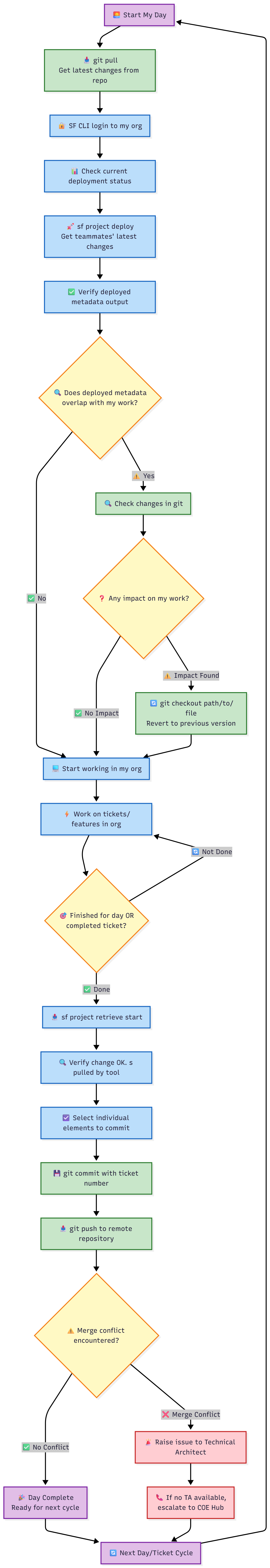 This chapter outlines the day-to-day development process that consultants follow when working with Salesforce deployments in a CI/CD environment. The workflow is designed to enable frequent, safe deployments while maintaining team collaboration and code quality.